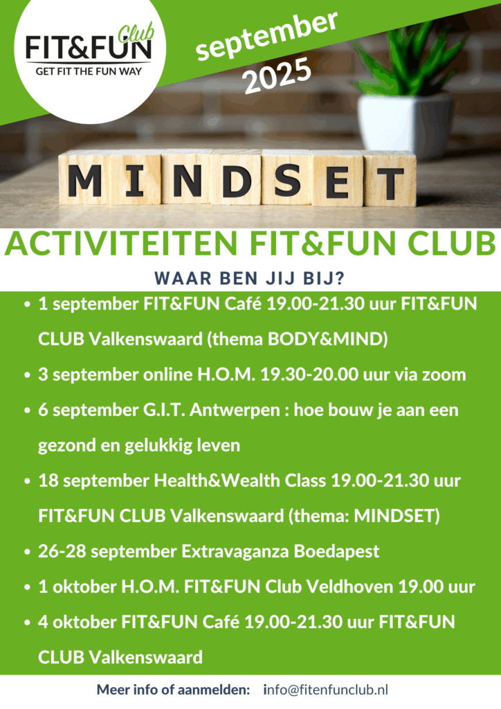 - Body & Mind Avond (1 sept. tijdens FIT&FUN Café) : Een gezellige avond met gezonde hapjes en drankjes waarbij we meer uitleggen over hoe je je Body&Mind van goede voeding kan voorzien en deze optimaal kunnen gaan werken.